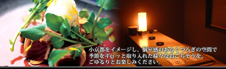 当店は京都の町家をイメージした個室空間で、その季節の一番美味しい素材を楽しめるお店です。素材を生かした料理には、農薬、硝酸態窒素を極力含まないバクタモンミネラル栽培野菜をはじめ、生産者の顔が見えるミネラル豊富な甘野菜や自社農園直送の契約特別栽培米・全国の漁港で揚った鮮魚などを積極的に使用しております。